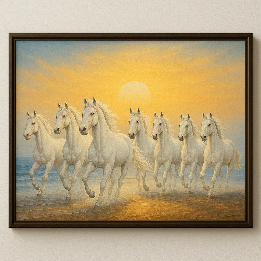 According to vastu, seven white horses represent speed, career growth, wealth, and harmony. Placing this painting in your living room, office, or workspace invites positive energy, removes obstacles, and helps achieve financial stability.