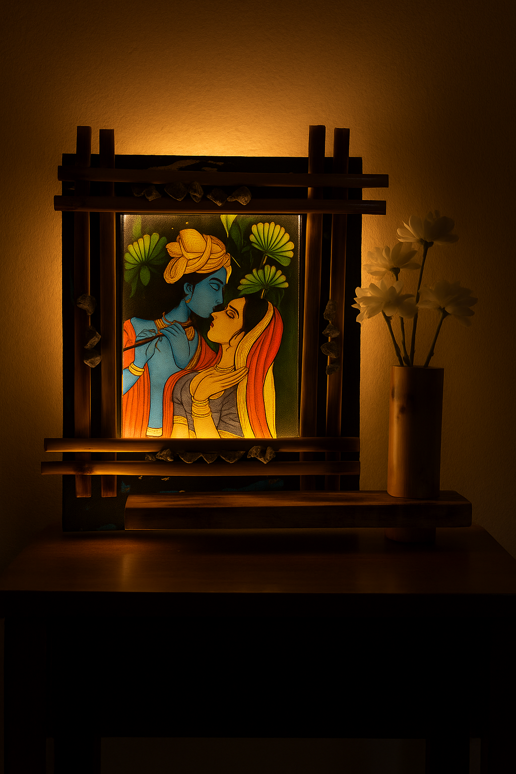 Enhance your home with this Handmade Bamboo Radha Krishna Wall Hanging. Featuring eco-friendly bamboo, natural stone detailing, and a flower vase — perfect for meditation rooms, living spaces, or gifting.