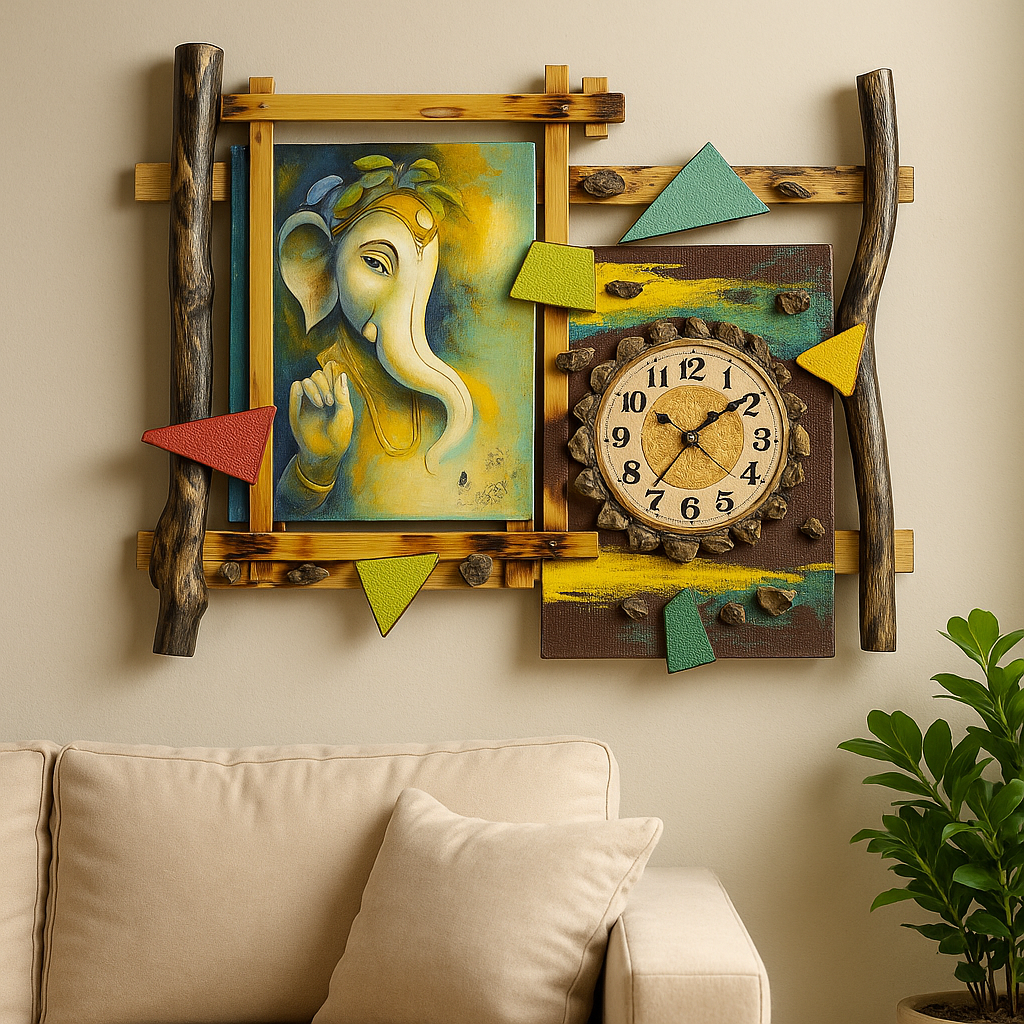 This unique Handmade Bamboo Tribal Art Wall Hanging with Clock combines colorful tribal artwork with a rustic bamboo frame and functional clock. Perfect for living rooms, offices, or gifting.