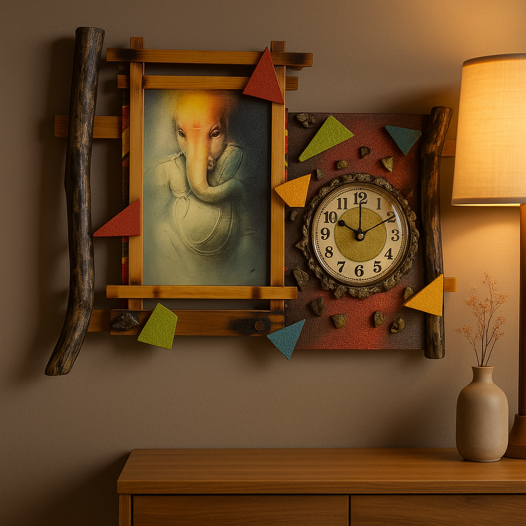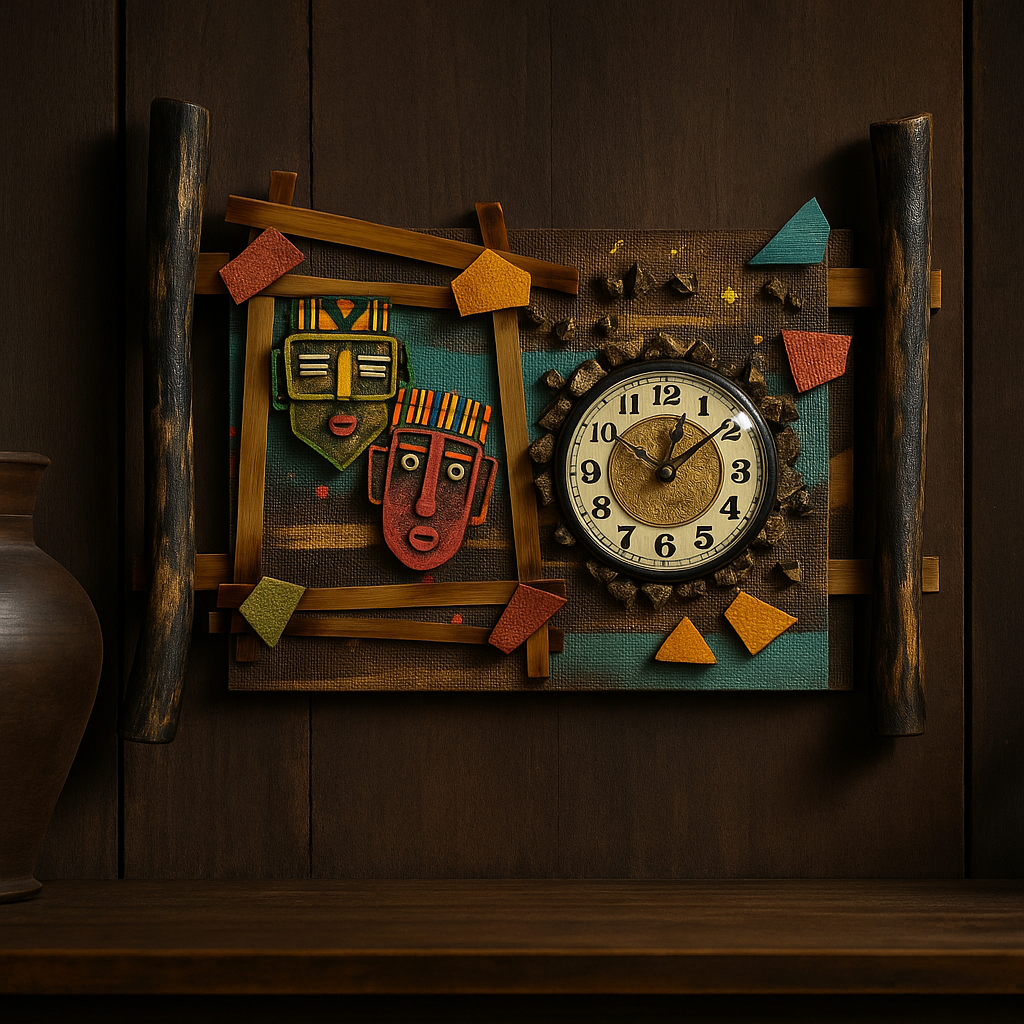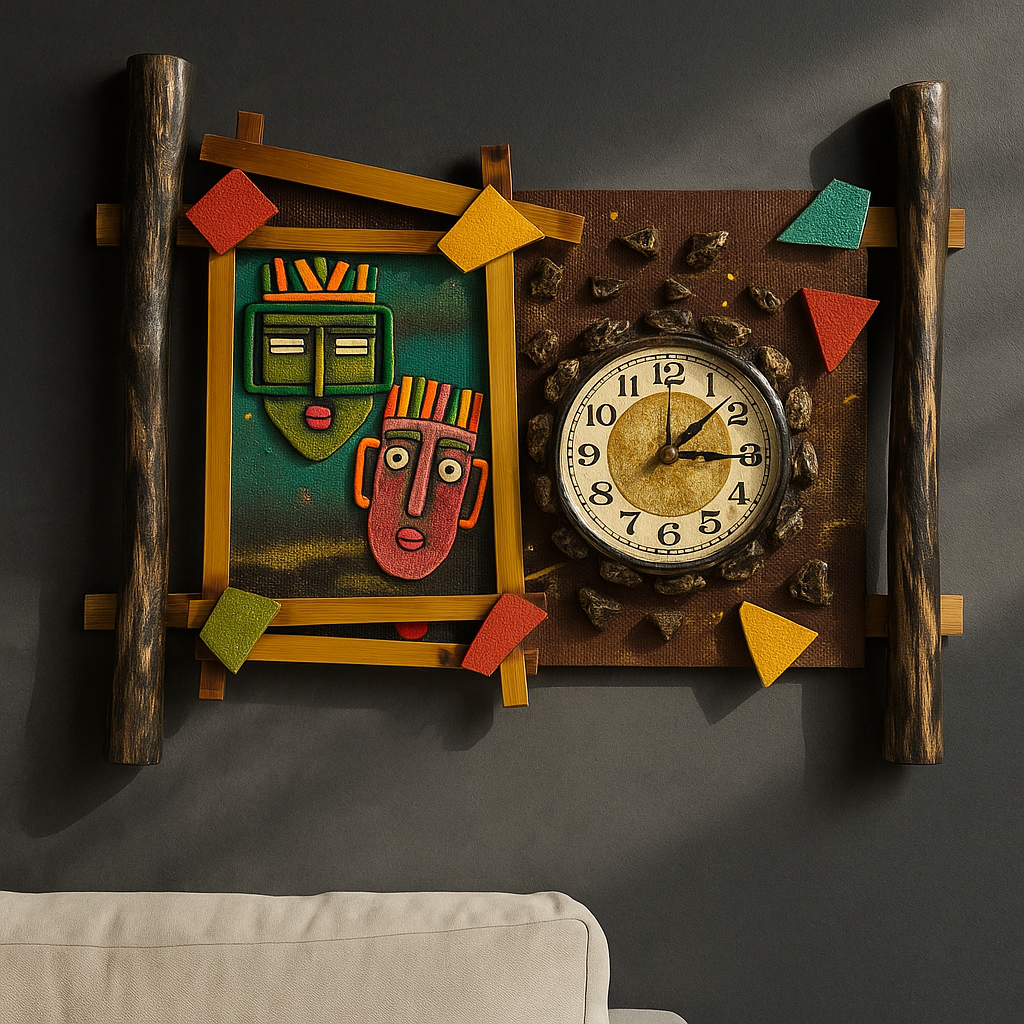 Add a bold and artistic touch to your walls with this Handmade Bamboo Tribal Art Wall Hanging with Decorative Clock. Designed with natural bamboo, colorful geometric accents, and tribal-inspired face artwork, this piece reflects both creativity and tradition.