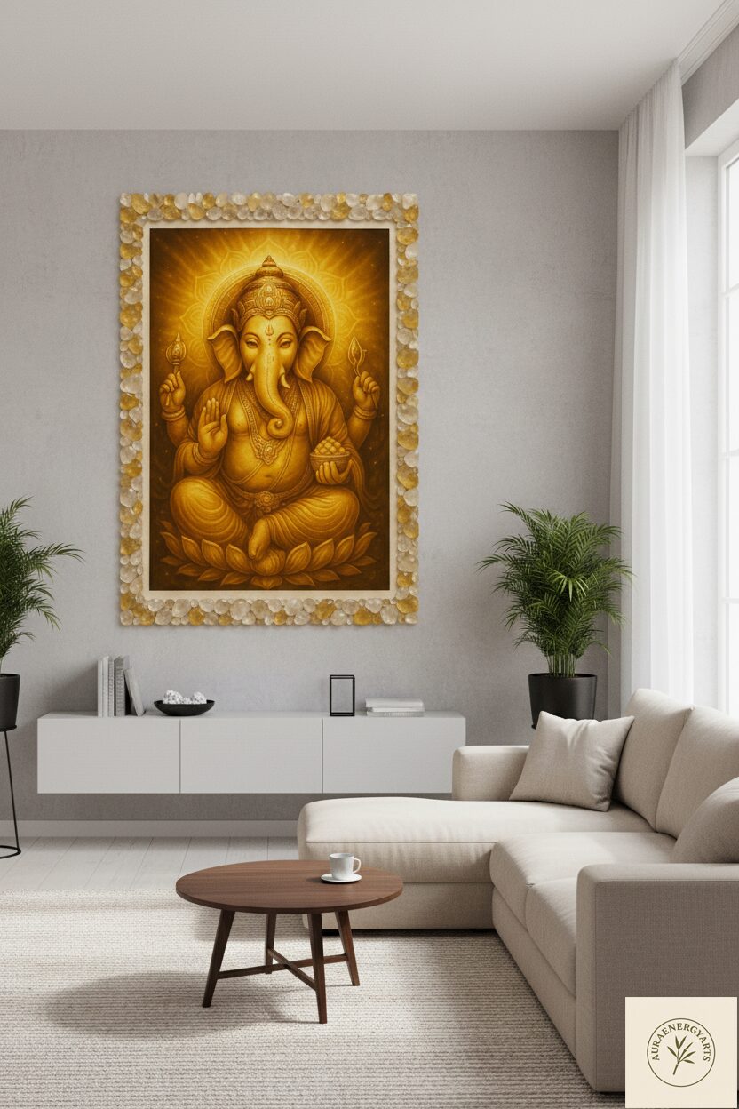 This Lord Ganesha Citrine & Clear Quartz Frame (A3 Size) is not just an art piece — it’s a sacred energy field that radiates peace, positivity, and divine strength.