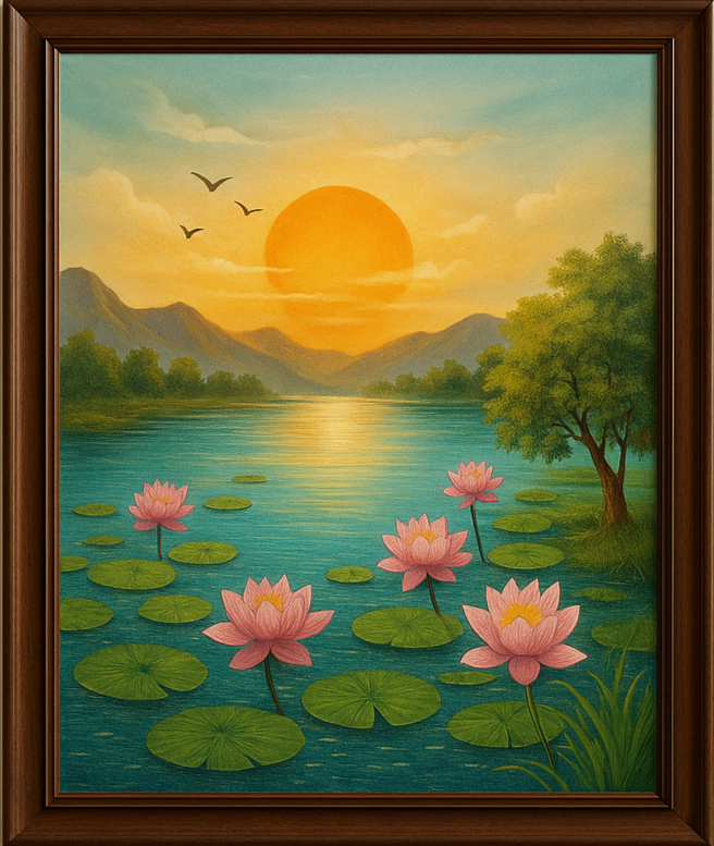 Bring peace, prosperity, and spiritual harmony into your home with this Lotus Pond with Rising Sun Painting, designed as per Vastu & Feng Shui principles.