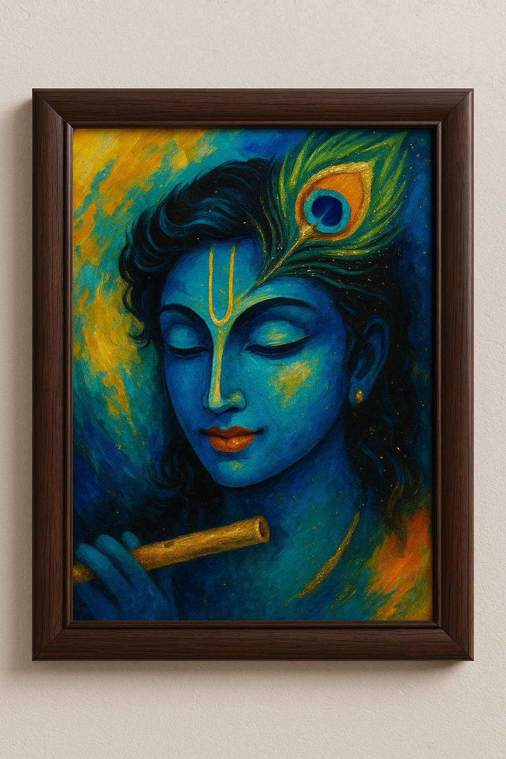 “Modern Krishna Abstract Painting – A4 Glossy Print with Wooden Frame & Pyrite Detailing”