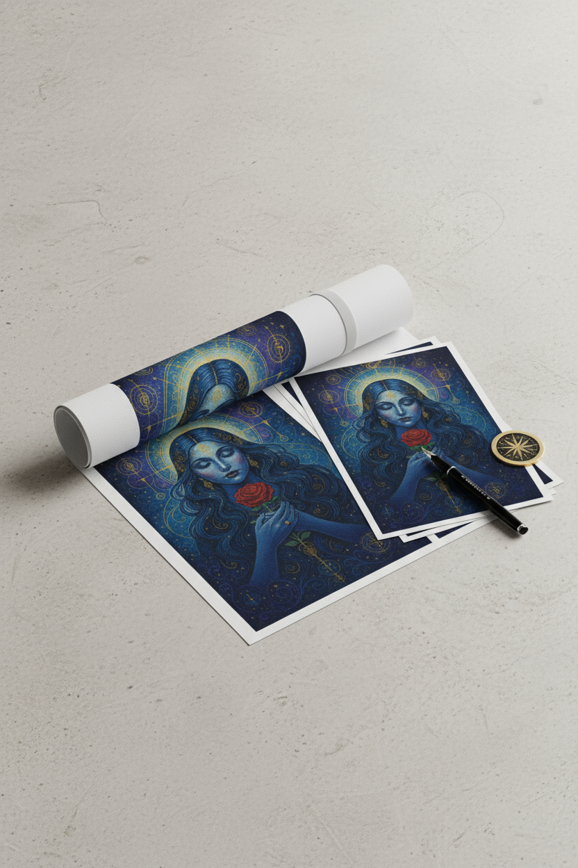 Bring harmony and divine beauty into your space with this Mystical Goddess Digital Wall Art. A serene goddess holding a rose, surrounded by golden sacred geometry, symbolizing feminine energy, balance, and peace. Instant digital download in high-resolution (8192×12288 px, 300 DPI).