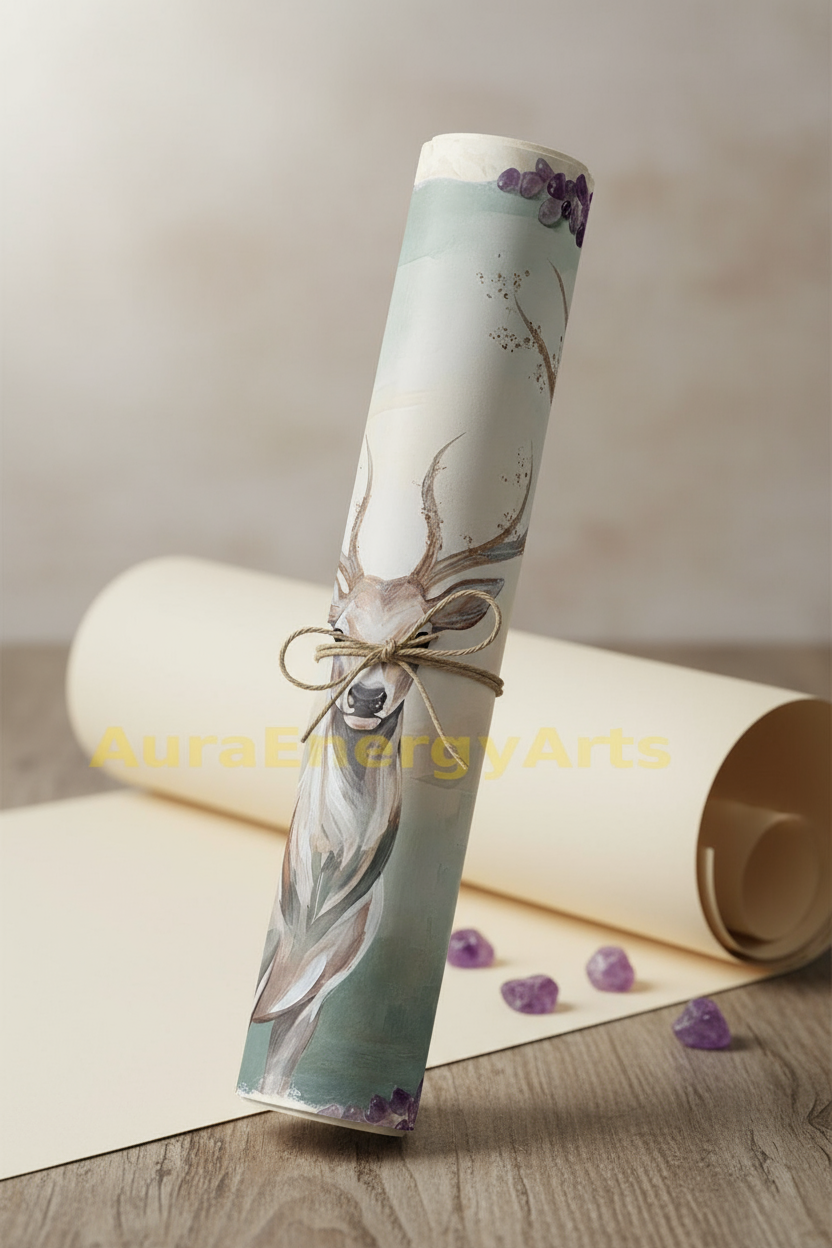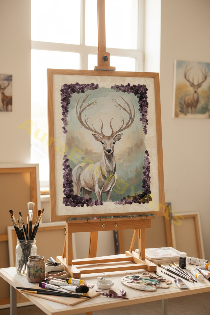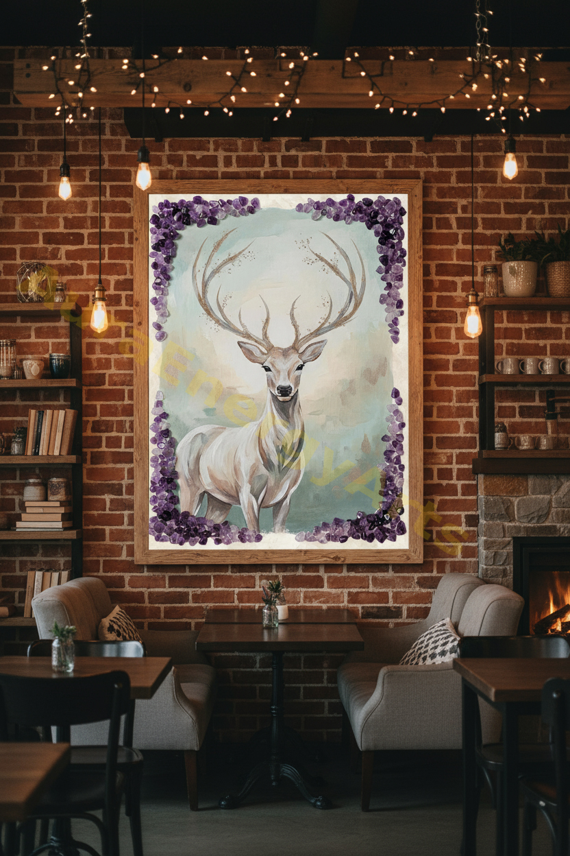 It features a majestic white deer with antlers surrounded by a handmade border of real amethyst crystal chips, carefully hand-placed and then photographed in high resolution.