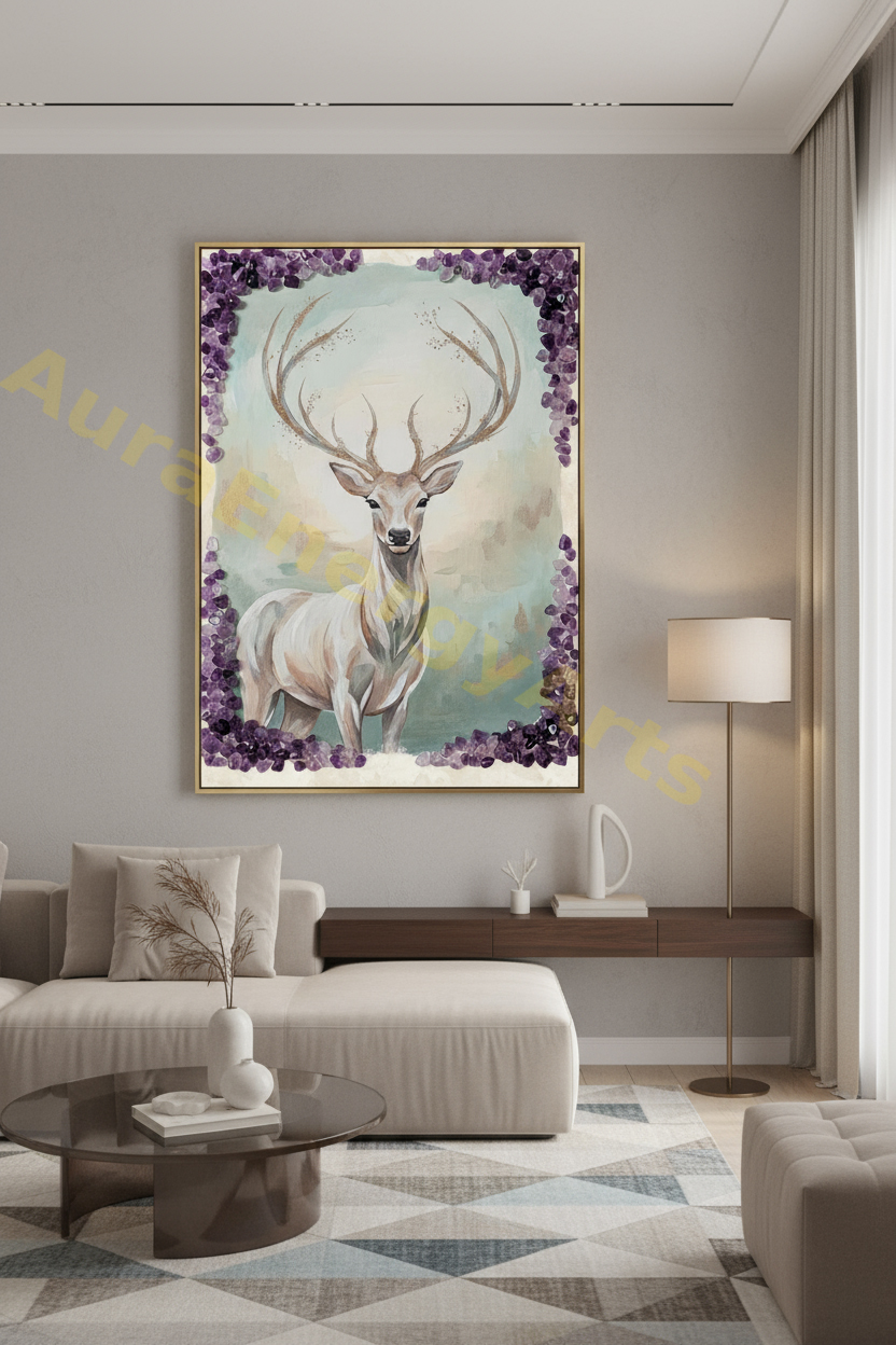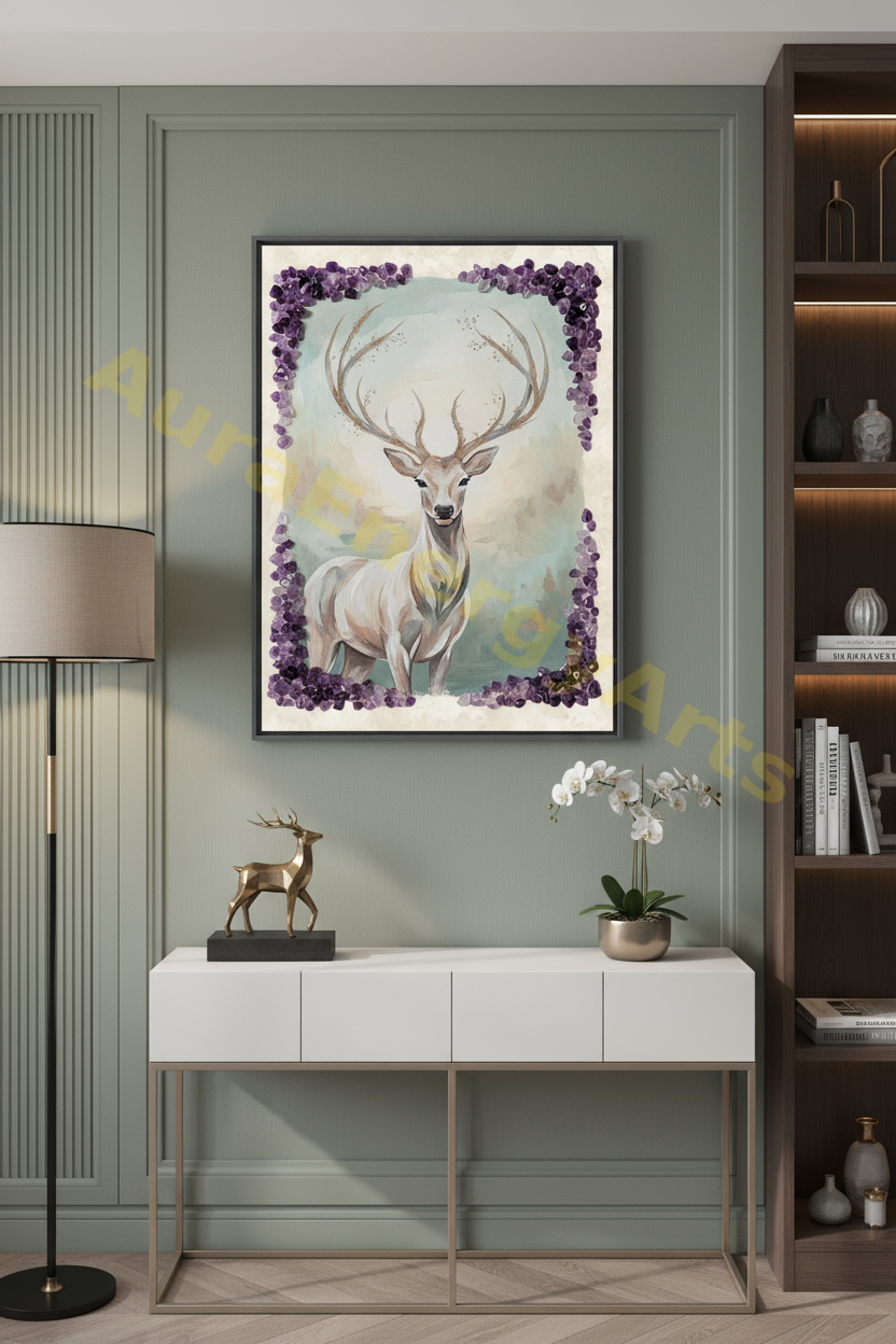 ✨ White Deer Spiritual Wall Art with Amethyst Crystal Border